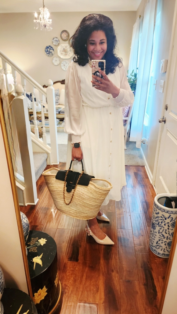 Next is my all-white outfit that I wore to the office. I have always been afraid of all white but thought I would give it a try. My dress is from Bloomchic, slingbacks are from Target, handbag is from MME. Mink. I added a pearl necklace, some pearl earrings and my look was complete. I got lots of compliments that day as well.