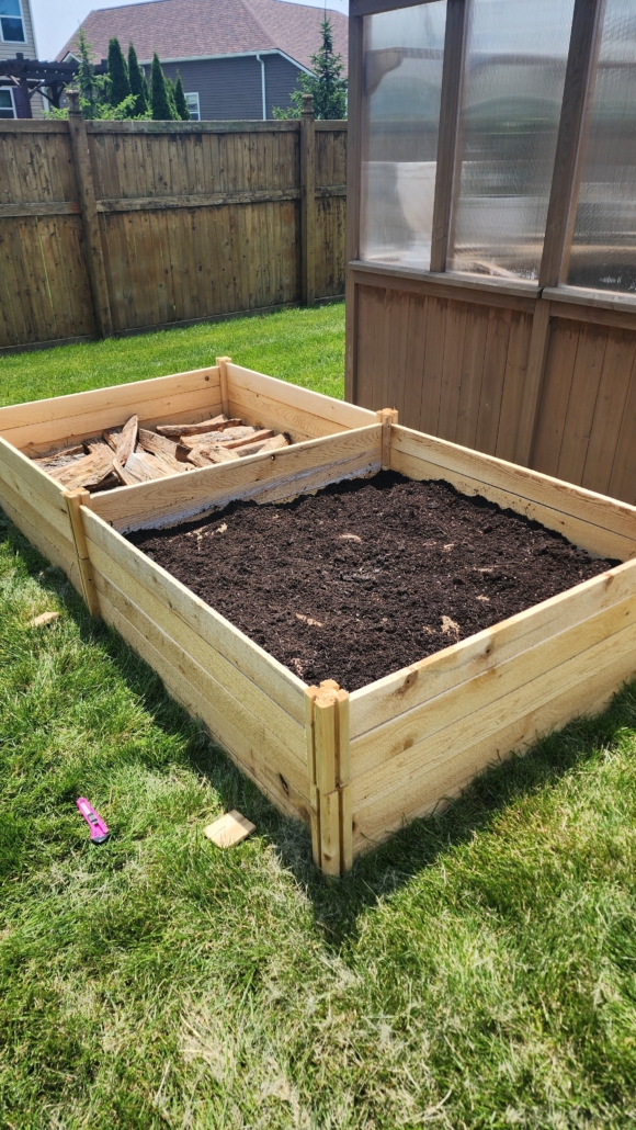 Next are my new raised beds! I ordered these from Home Depot and the installation was pretty easy. What took so long was filling it. My husband and I looked up ways to fill it in a cost-effective way. We used old logs, dirt, old flowers, and it turned out well. I planted sweet peas, hollyhocks and other flowers. They look great in the back yard next to the greenhouse.