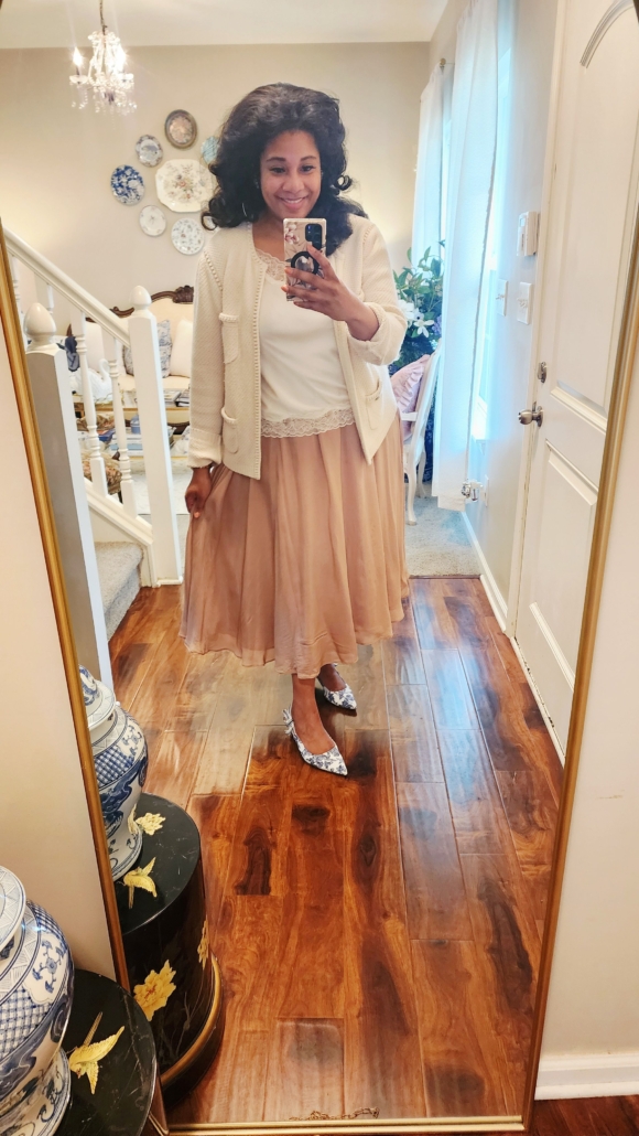 Finally, we have another work outfit. I love this maxi skirt from Ann Taylor. Sorry I cannot link it; it sold out quickly! I loved pairing my blue and white slingbacks from Target with this blush maxi. I think the colors flowed so well. I added a lace cami, and cream Chanel inspired cardigan. I was very pleased with this look. Remember, wear your best. Even if you don’t feel like it.