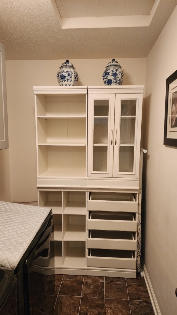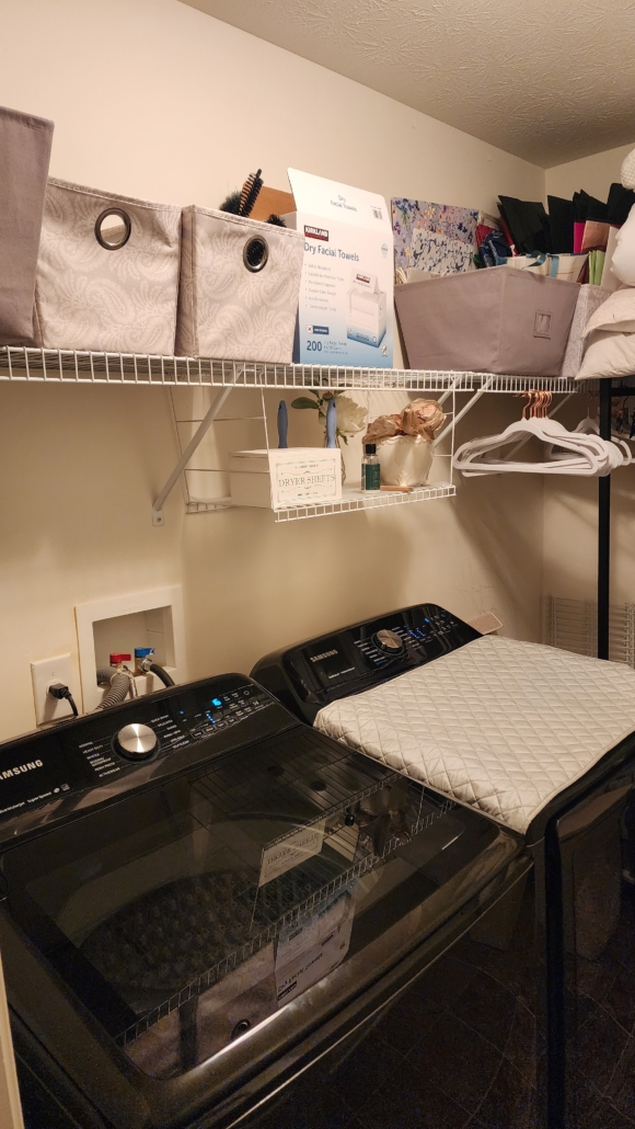 Now does this look familiar? This is my old closet organizer from my 2018 update! I did not want to get rid of these. I knew they would be a perfect fit in the laundry room. It looks so wonderful and provides more storage. I ordered some valet rods to install on the cabinets to use to hang my clothes from.