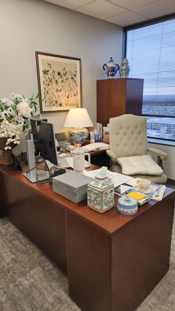 Here is a snapshot of my desk and windows! I finally have windows. You can see my floral arrangement, Ralph Lauren dragon lamp, my porcelain tissue holder, Wedgwood dish (it holds my paper clips and paper clip remover), elegant storage box, pink Stanley and office chair. There are hints of blue and white everywhere. The large piece in the back is my wardrobe, and it houses my coats and other accessories.