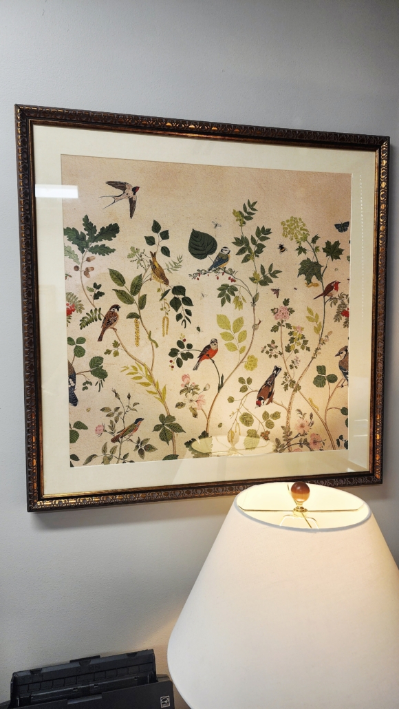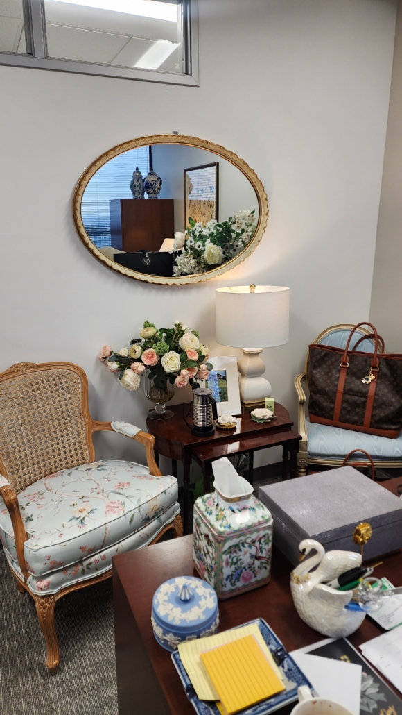 Next up is the front of my office. I brought along my vintage chairs. Of course, chairs are needed in my space for guests, but I like having my own chairs. We also have my nesting tables from FBMP and my vintage mirror that I purchased during the pandemic. Everything flows so beautifully and makes the space so comfortable. On the wall is a new picture. I found this chinoiserie style painting at HomeGoods and everyone loves it! It looks like a vintage scarf or wallpaper. Again, it ties in my chairs, mirror and, colors.